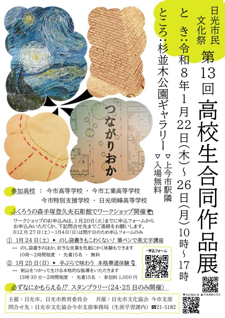 今年度も、日光市民文化祭の一環として13回目となる高校生合同作品展を開催します。