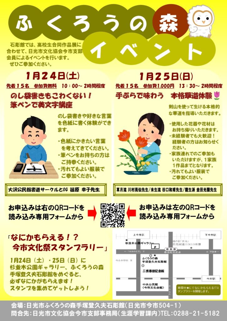 ふくろうの森ワークショップとなにかもらえるスタンプラリーは24日(土)・25日(日)のみ